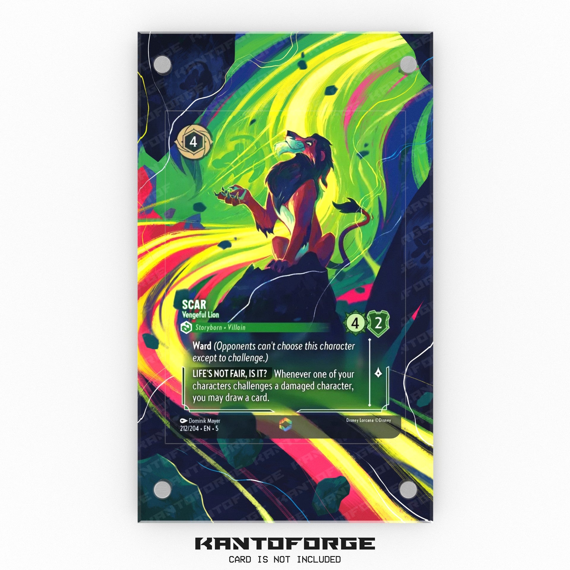 This case is designed to fit the following card: Scar - Vengeful Lion Elevate your Disney Lorcana trading card display with our premium UV protective acrylic case. Expertly designed to protect your card from harmful UV rays, it ensures both longevity and vibrancy. What sets our case apart is the...